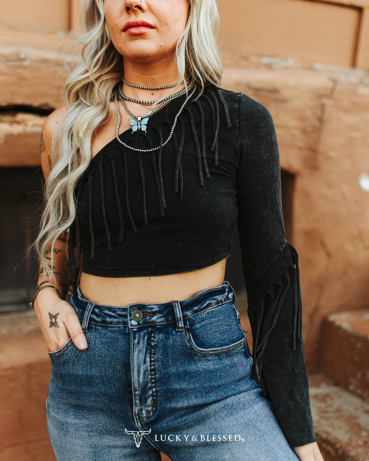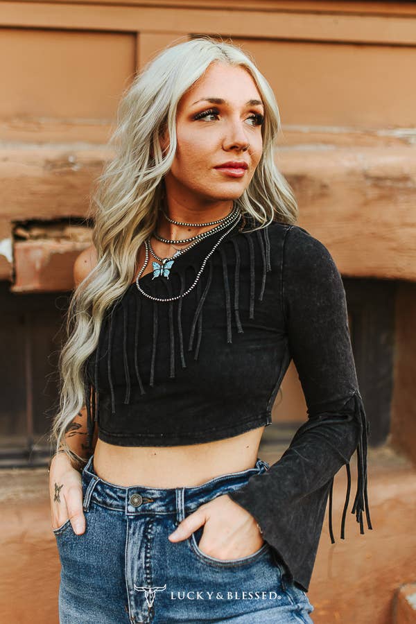 This bold and edgy black fringe crop is concert-season lineup. Crafted from a soft, mineral-wash stretch fabric, this top features front fringe detailing, dramatic bell sleeves with matching fringe accents, and a cropped that pairs effortlessly with high-waisted jeans or skirts. The vintage-inspired washed black tone adds a rugged, rustic vibe perfect for rodeo nights or country concerts. Designed for the modern cowgirl who wants to make a statement, this piece brings together Western attitude with chic festival flair. Ideal for women’s Western wear retailers, this standout style is available in regular and plus sizes for inclusive stocking. western fringe crop top black bell sleeve crop top wholesale western women’s tops Lucky & Blessed top boutique western fringe top rodeo cowgirl crop top fall western fashion wholesale festival fringe top boho western top country girl style black fringe cowgirl top rustic bell sleeve.