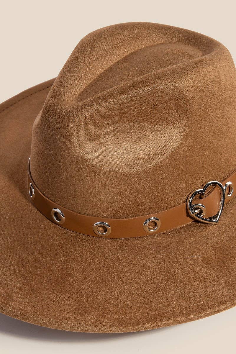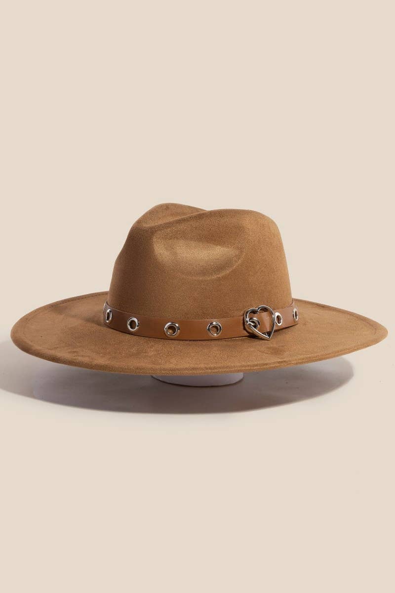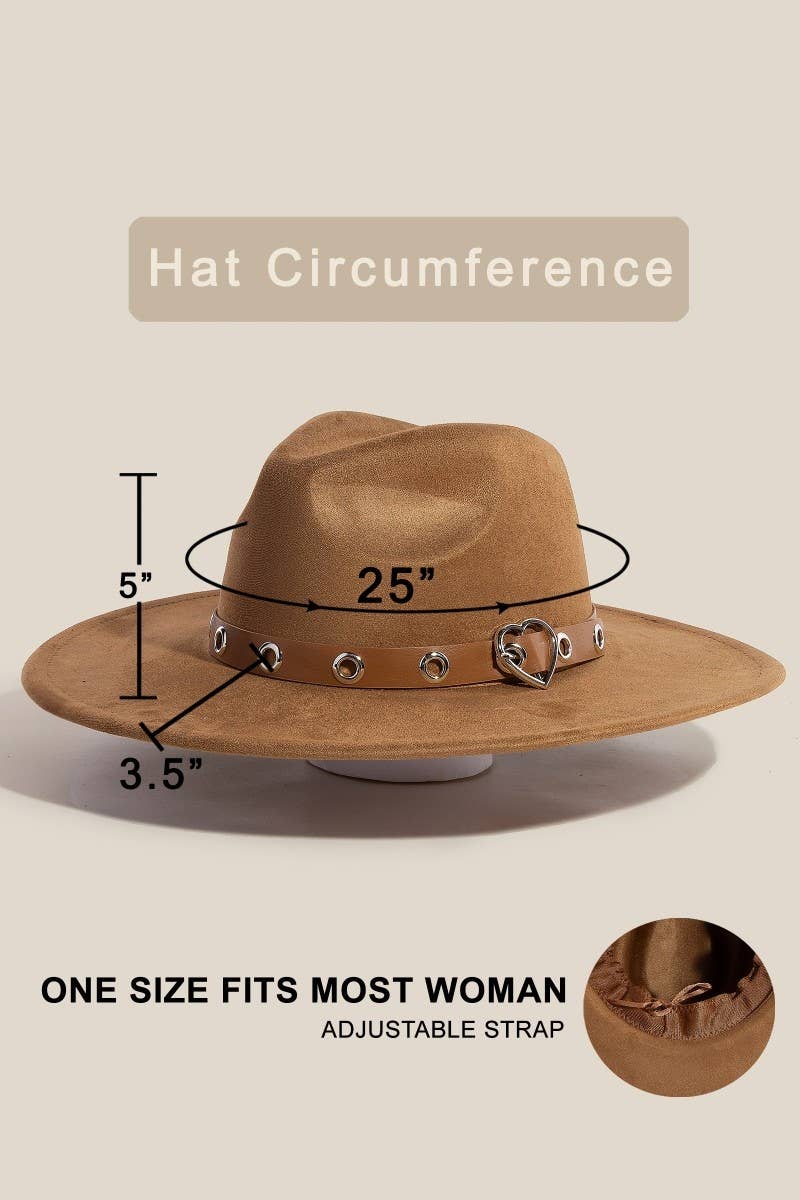 Incredibly soft material, this fedora hat carries a charming heart buckle grommet strap faux suede design. The perfect way to complete any outfit, whether you're dressing up or keeping it casual.