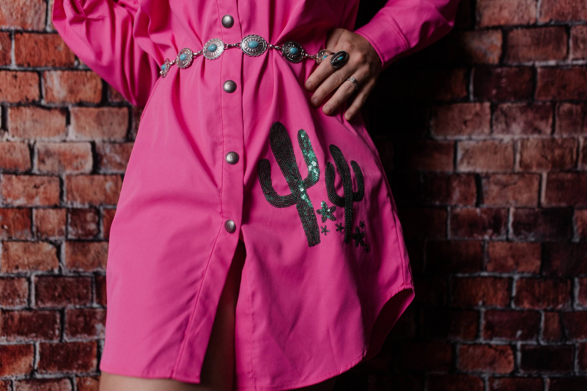 Southern Stylish Pink Cactus Shirt Dress with Sequin Embroidery Patches. Nice and Thick to help keep warm during the colder nights paired with your favorite boots.